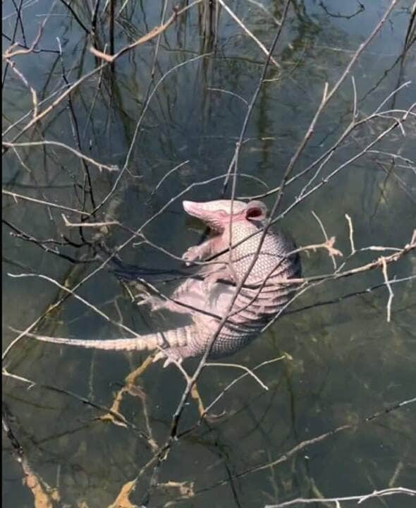Douglas passeava de barco quando se deparou com o tatu boiando, com praticamente só a cabeça para fora da água. O tatu já não tinha mais forças para nadar, aparentava estar muito cansado.