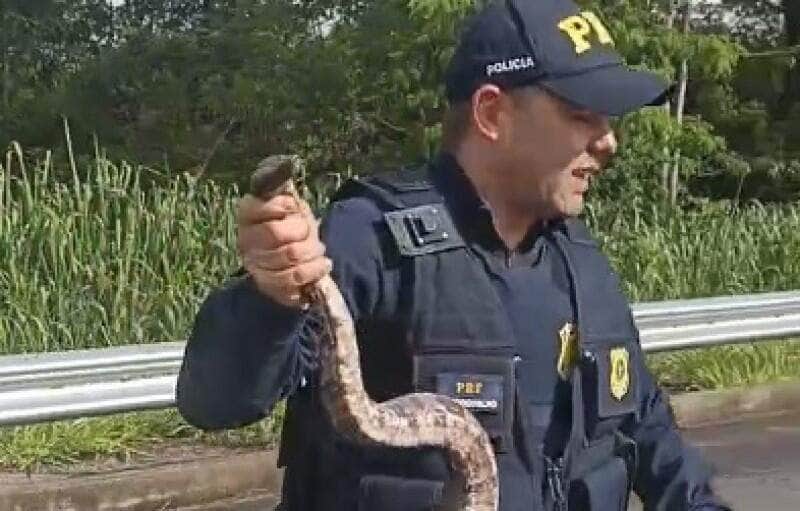 Jiboia é resgatada por policial rodoviário