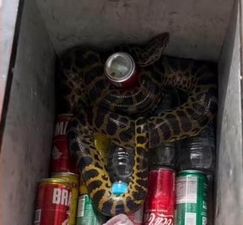 Uma sucuri-amarela decidiu se aventurar em uma caixa térmica, “agarrando” uma das latas de refrigerante, proporcionando um espetáculo surpreendente aos turistas presentes. Mas, afinal, cobras sentem calor?