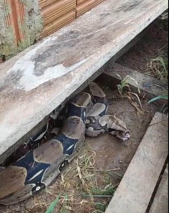 Nada amistosa, uma cobra jiboia foi descoberta quando estava escondida debaixo de uma alguma tábuas. Assista ao vídeo abaixo.