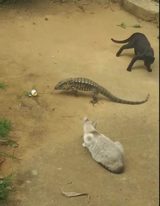 Famosos por sua agressividade e não fugir de um bom combate, um teiú mostrou ao contrário ao ‘arregar’ e fugir de um duelo contra dois gatos.