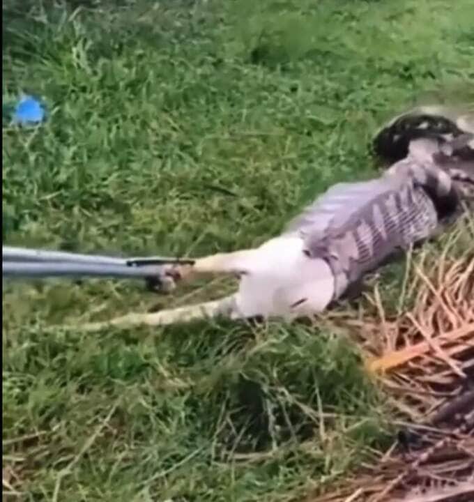 O bezerro havia sido abatido pela sucuri e ela já estava realizando o processo de deglutição, ou seja, engolindo o animal, quando uma pessoa simplesmente, começou a puxar, arrastando a cobra.