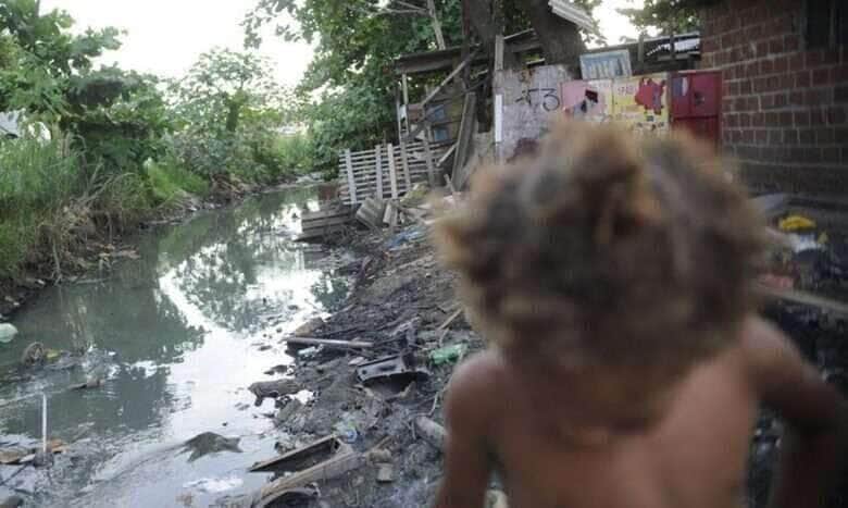 Imagem de riacho com falta de saneamento básico e uma criança passando em favela do Complexo da Maré