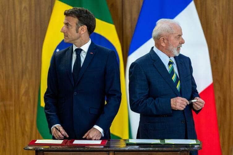 No último dia da visita de Estado ao Brasil, o presidente da França, Emmanuel Macron, foi recebido pelo presidente Luiz Inácio Lula da Silva no Palácio do Planalto, na tarde desta quinta-feira (28). Após uma reunião fechada, ambos fizeram uma declaração à imprensa. Questionado sobre a posição de Macron, contrária ao acordo comercial entre União Europeia e Mercosul, o presidente brasileiro ponderou que a negociação é feita por blocos de países, mas que é direito do francês ter discordância.