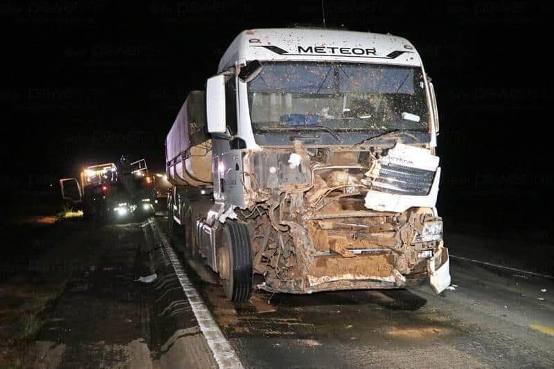 Uma delas, uma Scania de cor azul azul, estava carregada com milho e seguia no sentido contrário, foi atingida na traseira. A outra, de cor branca, estava parada no acostamento com problemas mecânicos quando foi atingida.