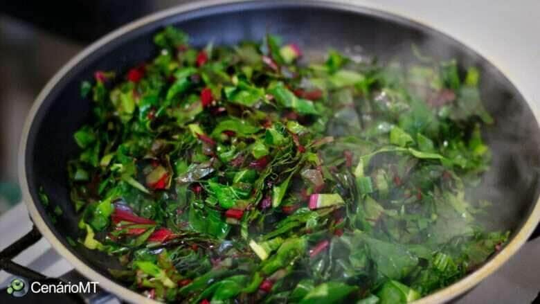 - Adicionando as folhas: Agora, é a vez das folhas. Coloque-as na frigideira e mexa bem. Tempere com sal e pimenta-do-reino a gosto. Cozinhe por mais alguns minutos, até que as folhas murchem.