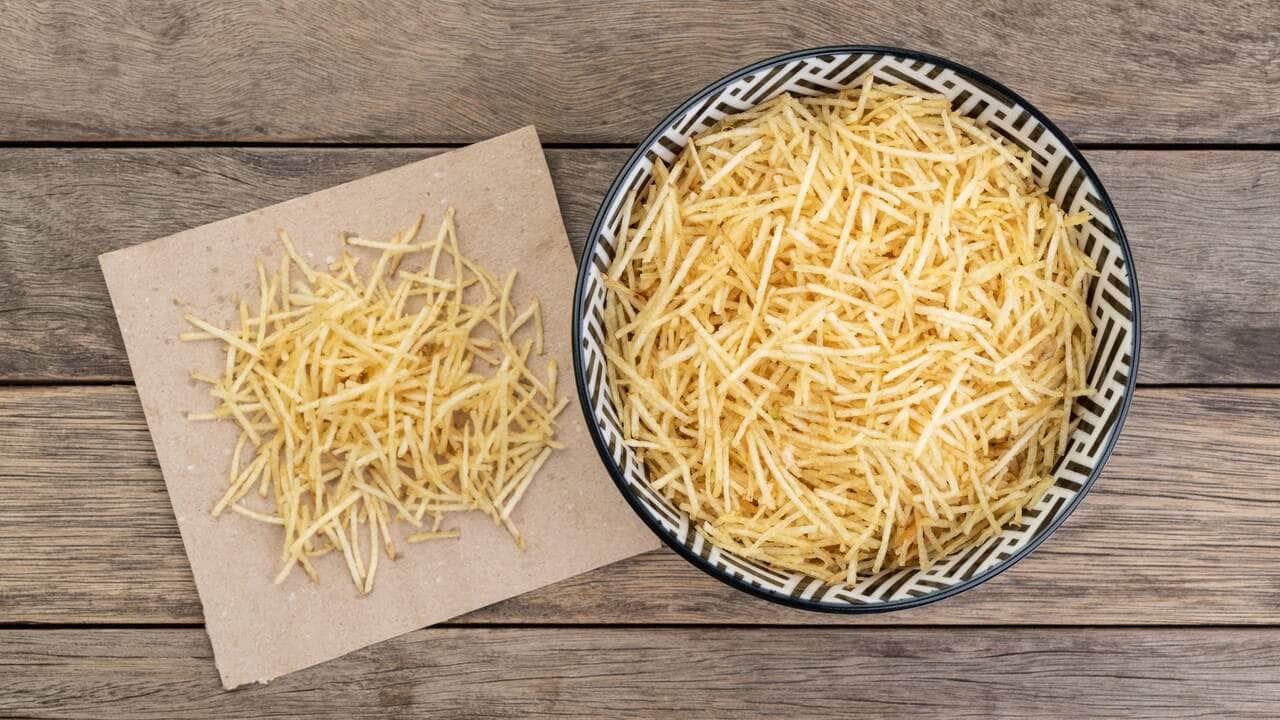 - Utilize um mandolin ou um ralador grosso para cortar as batatas em tiras finas, como palitos de fósforo.