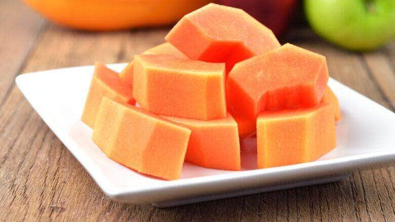 - Corte o mamão em cubos médios de aproximadamente 2 cm.