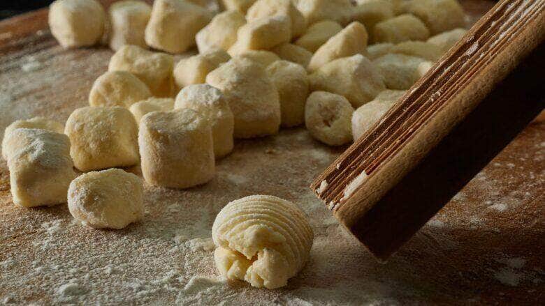 Passo 4: Modele os Nhoques Em uma superfície enfarinhada, divida a massa em pequenas porções e role cada porção em uma corda fina. Corte pedaços de cerca de 2 cm e marque-os com um garfo para criar ranhuras.