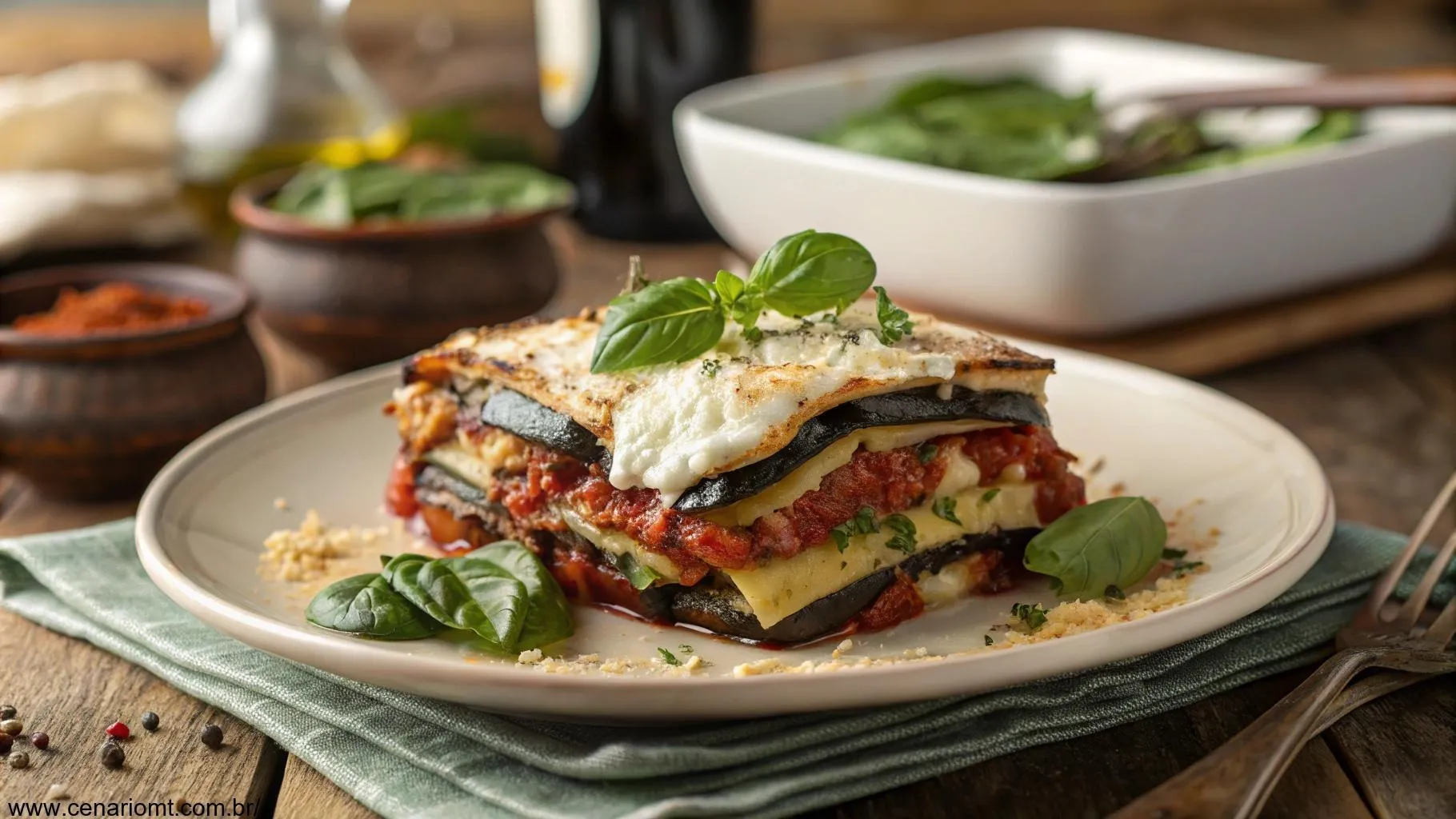 Lasanha de berinjela com ricota e espinafre, servida em prato rústico com detalhes das camadas