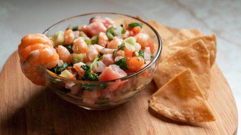 - Sirva gelado: Leve o ceviche à geladeira por pelo menos 15 minutos antes de servir. Sirva gelado com chips de tortilha ou batata doce (opcional) e desfrute de um sabor fresco e refrescante.