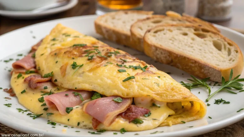 Omelete recheada com queijo e presunto, recém feita, servida em um prato branco com ervas e fatia de pão.