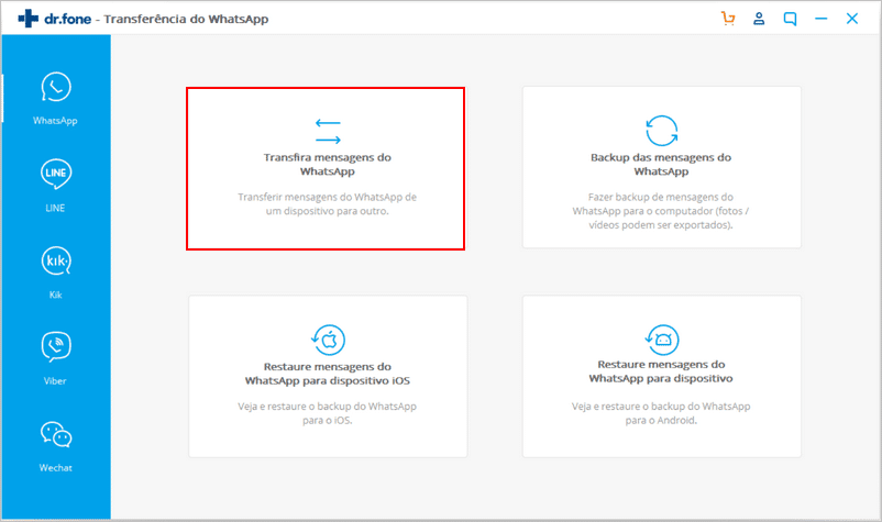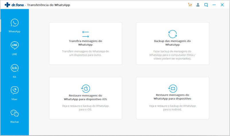 - Transferência do WhatsApp – Fazer backup, restaurar e transferir os dados do seu WhatsApp, assim como também os dados de Line, Viber, Kik e WeChat.