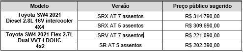 Os preços sugeridos para a Nova SW4 2021 são os seguintes:
