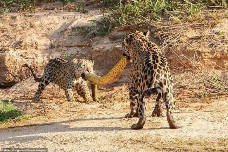 A selva é um ringue onde a sobrevivência é a única regra. Nesta imagem impressionante, testemunhamos uma luta feroz entre predadores: onças-pintadas e uma sucuri amarela. A força bruta e a agilidade se unem em uma disputa épica pela vida. [Mundo animal]